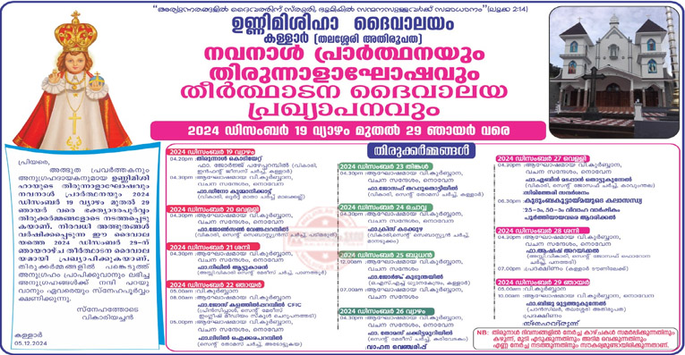 കള്ളാര് ഉണ്ണിമിശിഹാ ദൈവാലയത്തില് തിരുന്നാളിന് ആരംഭം കുറിച്ച് വികാരി ഫാ. ജോര്ജ് പഴേപറമ്പില് കൊടിയേറ്റി. തുടര്ന്ന് നടന്ന തിരുക്കര്മങ്ങള്ക്ക് മാലക്കല്ല് ലൂര്ദ് മാതാ പള്ളി വികാരി ഫാ. ഡിനോ കുമ്മാനിക്കാട്ട് നേതൃത്വം നല്കി.