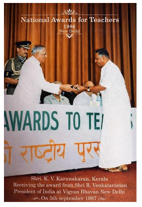 അധ്യാപകര്ക്കള്ള 1985 ലെ സംസ്ഥാന അവാര്ഡ് കരുണാകരന് മാസ്റ്റര്ക്ക് ഉറപ്പാണെന്ന് ഏതാണ്ട് പ്രതീക്ഷിച്ചതായിരുന്നു. പക്ഷേ അദ്ദേഹത്തിനേയും അദ്ദേഹത്തിന്റെ ശിഷ്യ ഗണങ്ങളെയും നിരാശപ്പെടുത്തിയായിരുന്നു ആ അവാര്ഡ് പ്രഖ്യാപനം. ഇരട്ടിയിലേറെ മധുരവുമായി തൊട്ടടുത്ത വര്ഷം കണ്ടത്തില് വളപ്പില് കെ. വി. കരുണാകരനെ തേടിയെത്തിയത് അദ്ധ്യാപകര്ക്കുള്ള ദേശീയ പുരസ്കാരമായിരുന്നു.